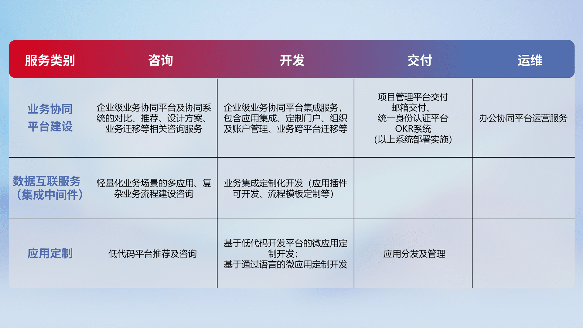 针对钉钉、、、、企微、、、IDaas等平台级产品提供产品的规划、、方案、、、交付、、、定制化开发等服务,,,实现如统一协同办公、、、、智能客户服务、、、、混合会议管理、、智能数据查询、、等业务场景,,,实现数字化转型。。